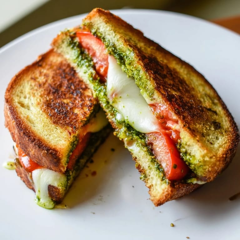 Pin The smell of toasted sourdough and melting mozzarella pulled my partner into the kitchen before I even called out that lunch was ready. I had been experimenting with ways to make grilled cheese feel less like a lazy weekday meal and more like something worth savoring. That afternoon, I spread basil pesto across warm bread, layered thick slices of fresh mozzarella and summer tomatoes, and pressed the whole thing into a hot skillet. The result was so good we ate standing at the counter, cheese stretching between bites.