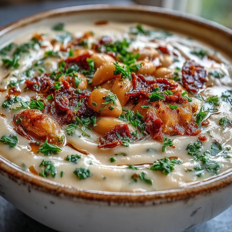 Pin There's something about the smell of pancetta crisping in a pot that stops you mid-thought. I discovered this Tuscan soup on a chilly afternoon when my neighbor Marco knocked on the door with sun-dried tomatoes from his garden and a craving for something warming. We stood in my kitchen watching the fat render, golden and fragrant, and by the time the cream swirled in, I knew this was the kind of soup that makes people linger at the table.