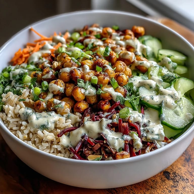 Too many bowls feel like a side dish pretending to be dinner, but this one delivers real nutrition and satisfaction. Brown rice and chickpeas together create a complete protein, peanuts add healthy fats that help you absorb nutrients, and raw vegetables keep everything light and alive. The textures matter too—creamy dressing, crunchy peanuts, tender rice, crisp vegetables—your mouth stays engaged with every spoonful instead of getting bored halfway through.