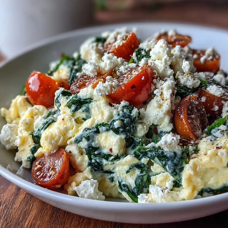 For perfectly creamy scrambled eggs, remove them from the heat when they still look slightly underdone, as they will continue to cook from residual heat. When sautéing spinach, don't overcrowd the pan - work in batches if needed for even wilting. The feta can be crumbled directly onto the hot eggs to slightly soften, enhancing its creamy texture.