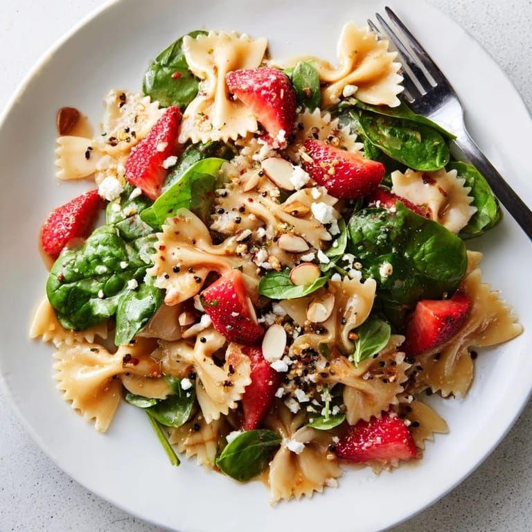 Pin Last spring my neighbor brought over a basket of strawberries from her garden and insisted I try them with pasta. I thought she was joking until that first bite of sweet fruit against tender noodles and tangy dressing. Now it is the salad I make when I need something that feels like sunshine on a plate.